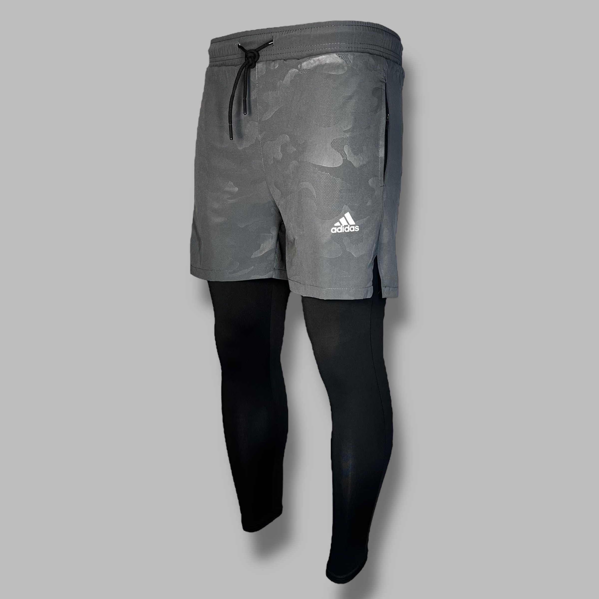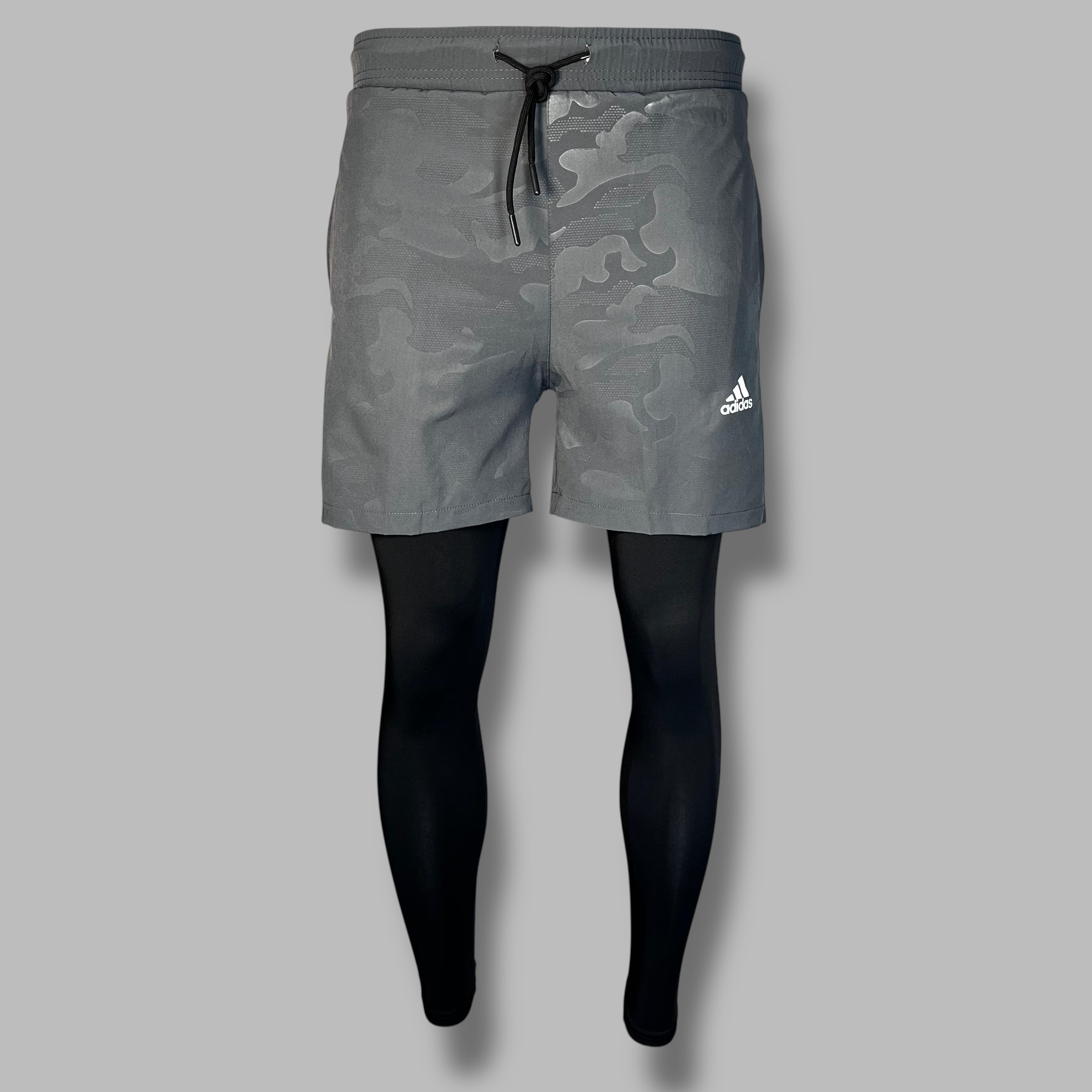 Шорты + лосины Adidas 0131 серый — практичный вариант для бега и фитнеса.